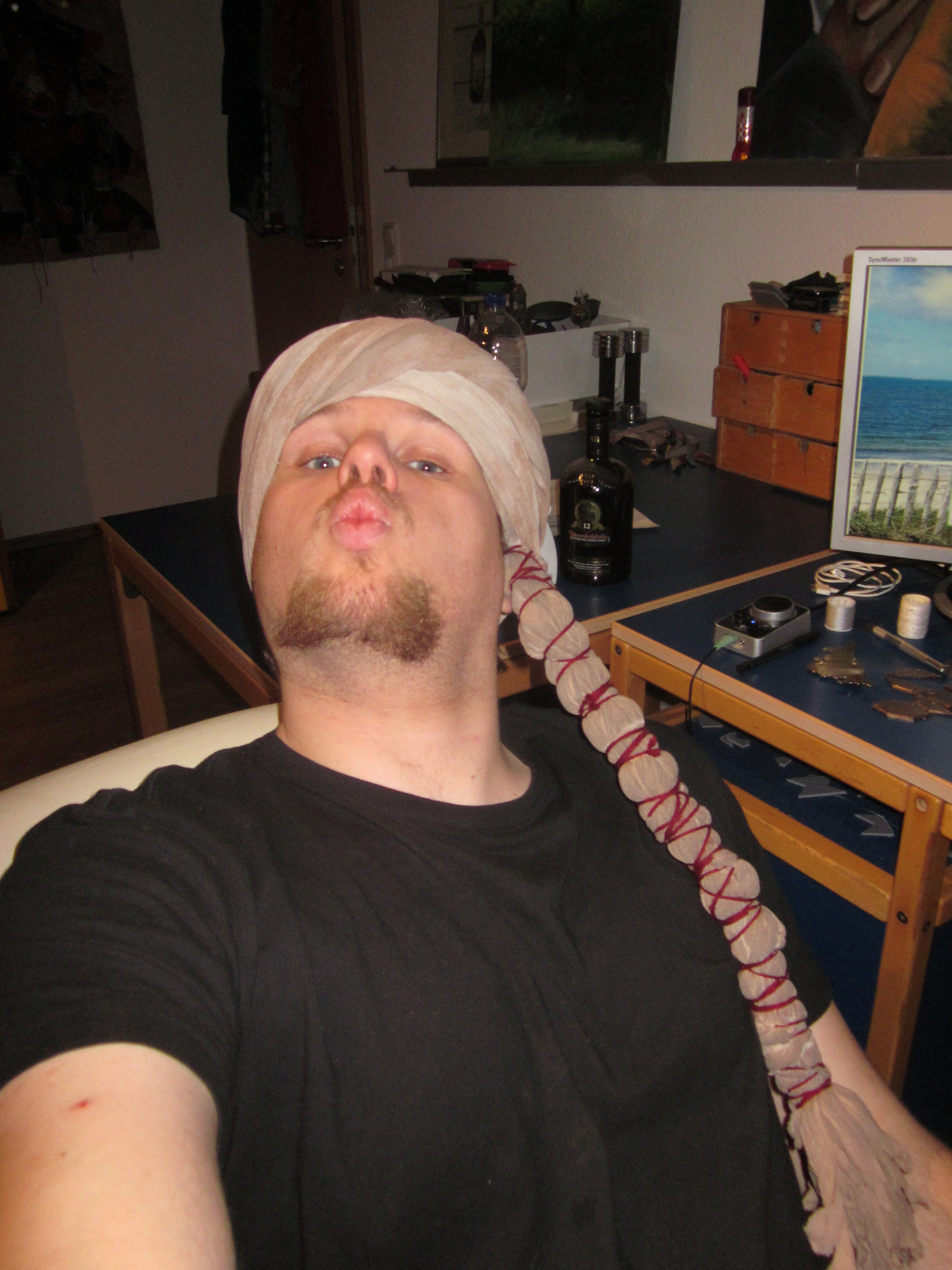 jetzt mit Turban-Zaddelzopfdings damit der Lappen nicht immer vor der Klamotte  hängt.